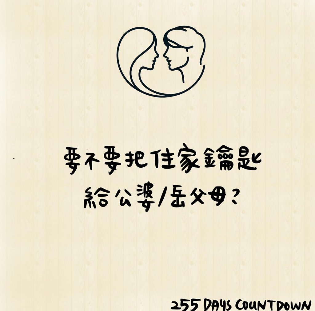 因此,我認為伴侶自住的住家鑰匙是不宜提供給公婆/岳父母的,畢竟我個人並不希望疲憊下班到家打開大門,原以為可以攤成泥好好休息,卻發現有長輩已經坐在沙發上久等,或者在伴侶間親密互動的時候,突然有人無預警開門😅