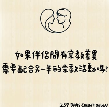 也正因為宗教信仰差異需要互相尊重與理解,我個人認為如果願意抱持著開放的心態參與另一半的宗教活動當然很好,但並不需要勉強自己或另一半認同及參與對方的教宗信仰與活動。