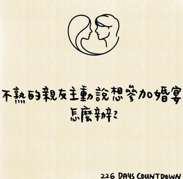 以我跟GYB的情形而言,我們算是舉辦小型家宴,所以如果是「不熟的朋友」主動表達想要參加婚宴,我可能會選擇用不得罪人的語氣委婉表達:「因為婚宴是採行家宴的形式,所以可能…」(懂得都懂);至於「不熟的親戚/長輩」的部分,或許可以表達目前打算小小簡單舉辦,婚宴場地與座位數量還不確定等等,先打打太極應付,再讓爸媽輩的出馬應付自己的同輩親屬。
