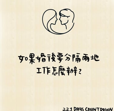 由於我跟GYB其實都偏向不分隔兩地,所以往後也會因此就工作地點與模式做適當的調整。至於婚後如果迫於無奈而需要分隔兩地工作,我認為首先要掌握的是「需要分隔兩地的時間長短」,如果是短期的,那就在前述的現狀基礎上做調整以為應對;如果是長期的,那就需要伴侶間好好討論是否要換工作,或與公司商議其他的任職模式了。