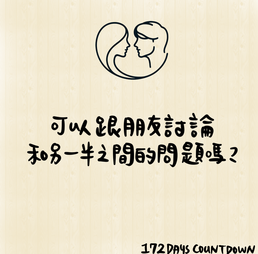 所以我個人認為其實是可以跟自己熟悉信任的好朋友討論與另一半間的問題的,但並不是所有的問題都適合跟另一半以外的人討論,一切都是要在有分寸,並拿捏這些問題是否涉及自己與另一半的隱私,或是屬於另一半不願意讓第三人知道的領域。
