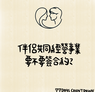 我個人認為如果伴侶間確定要共同經營事業,訂定合約或者共同構築明確的合作模式其實是對於自己以及對方權益的保護,所以簽訂紙本契約當然是最妥善完整的方式,但如果伴侶間覺得這樣操作傷感情或太生硬疏離,也可以考慮在雙方對於合作模式達成共識之後,在通訊軟體類的APP上以「共同」的對話紀錄、MEMO記事功能來記錄雙方討論出的結果並予以保存,既能夠避免紙本契約的公事化感,也可以達成紀錄雙方合意的合作方式的效果。