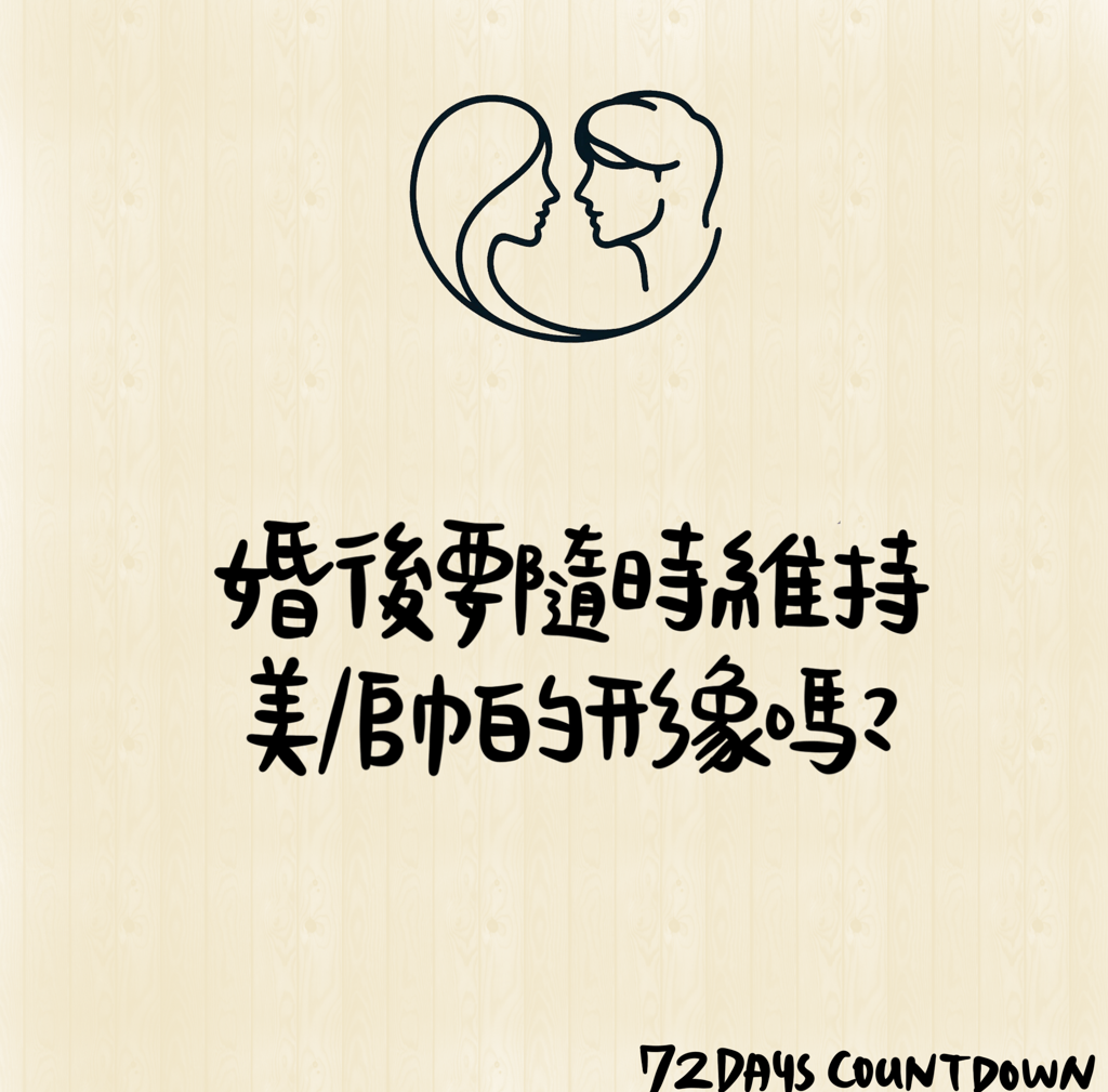 伴侶在交往期間如果沒有試婚/同居,往往會盡可能表現出自己最美好的一面,而結婚同住後相處時間顯著拉長,並共同擁有更多柴米油鹽醬醋茶的生活大小事,基本上是很難隨時隨地都美美帥帥的,如果刻意追求隨時隨地維持形象,可能也很快就會開始感到疲憊,所以我認為婚後並不需要刻意隨時維持美/帥的形象。